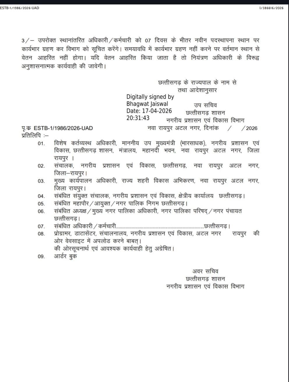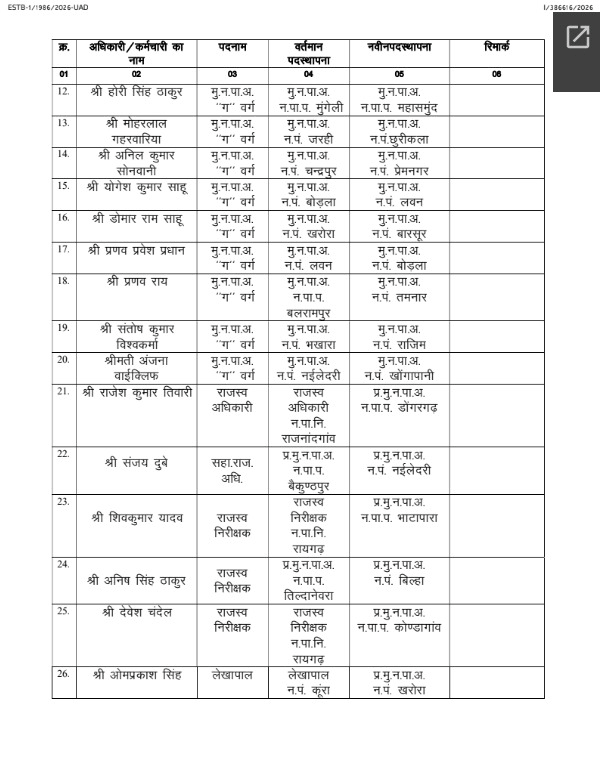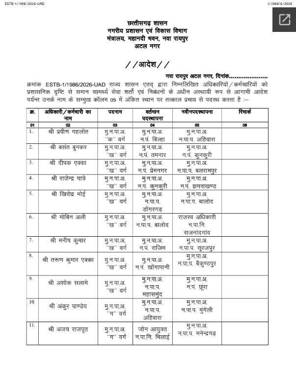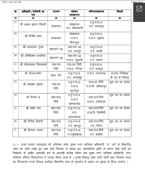 लगातार बढ़ते दबाव और प्रशासनिक असंतोष को देखते हुए राज्य शासन ने आखिरकार हस्तक्षेप किया। मामले की संवेदनशीलता को ध्यान में रखते हुए प्रणव राय का तबादला कर दिया गया और उन्हें रायगढ़ जिले के तमनार नगर पालिका में नई जिम्मेदारी सौंपी गई है।
