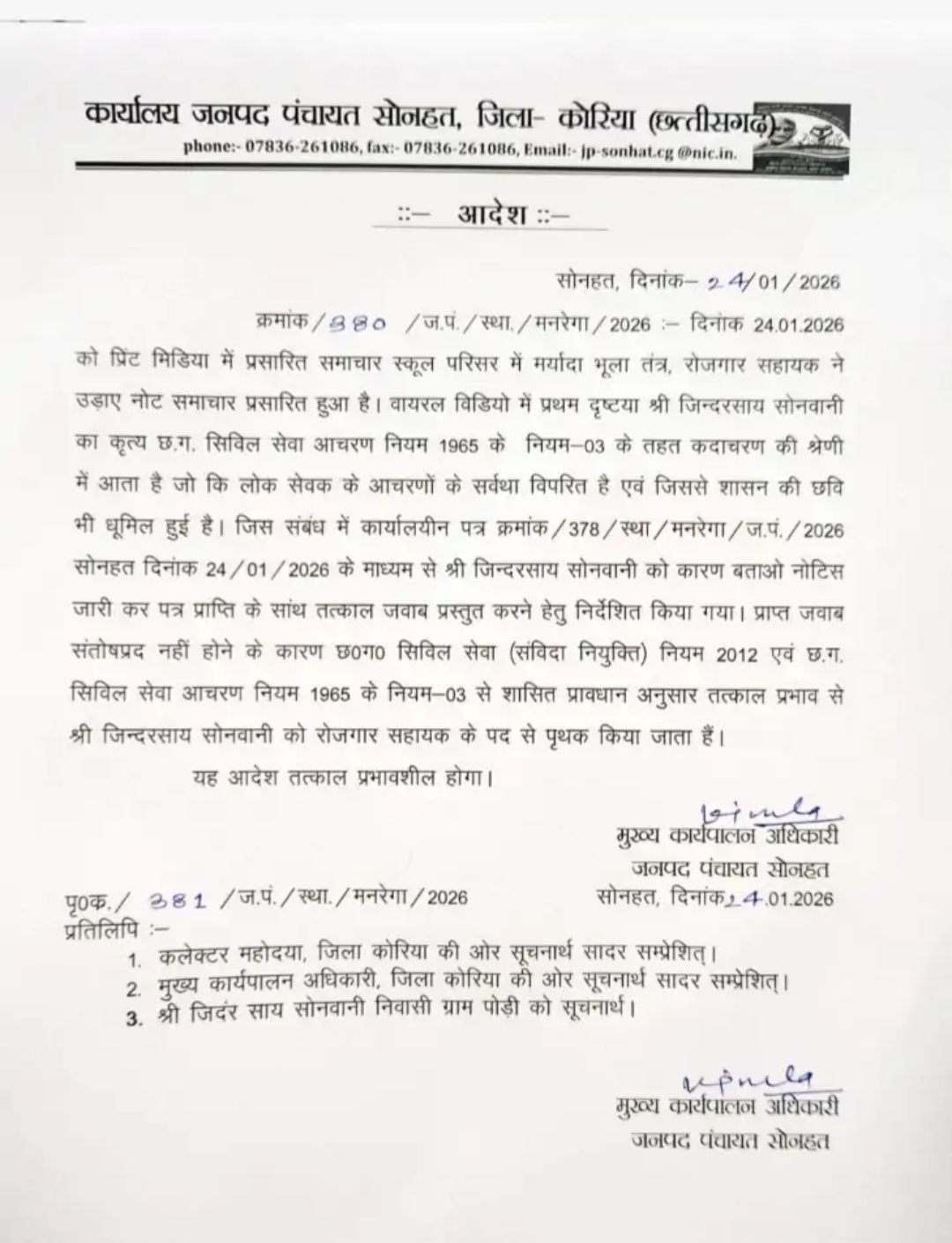 सोशल मीडिया पर वीडियो के तेजी से फैलने के बाद जिला प्रशासन पर सवाल खड़े होने लगे। मामले की गंभीरता को देखते हुए जनपद पंचायत प्रशासन ने त्वरित कार्रवाई करते हुए संबंधित रोजगार सहायक को सेवा से हटा दिया। अधिकारियों का कहना है कि सरकारी दायित्व निभाने वाले व्यक्ति से इस तरह के आचरण की कोई गुंजाइश नहीं है।