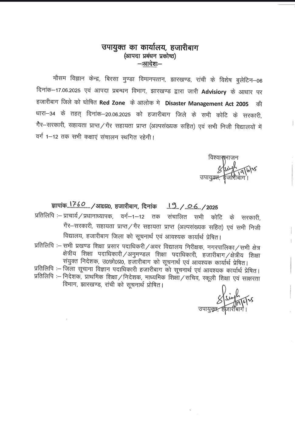 अगर कोई स्कूल इस आदेश को नहीं मानेगा, तो उस पर कानूनी कार्रवाई की जाएगी। जारी आदेश में कहा गया है कि भारत मौसम विज्ञान विभाग, भारत मौसम विज्ञान केन्द्र, रांची के द्वारा 17 जून को जारी विशेष बुलेटिन में हजारीबाग जिले के रेड जोन के अंतर्गत चिन्हित किया गया है। इस कारण भारी बारिश को देखते हुए 20 जून (शुक्रवार) को भी जिले के सभी कोटि के विद्यालय बन्द रहेगी। उक्त आदेश का अनुपालन नहीं किये जाने पर संबंधित विद्यालय/संस्थान आपदा प्रबंधन अधिनियम-2005 की सुसंगत धारा के तहत उत्तरदायी होंगे।