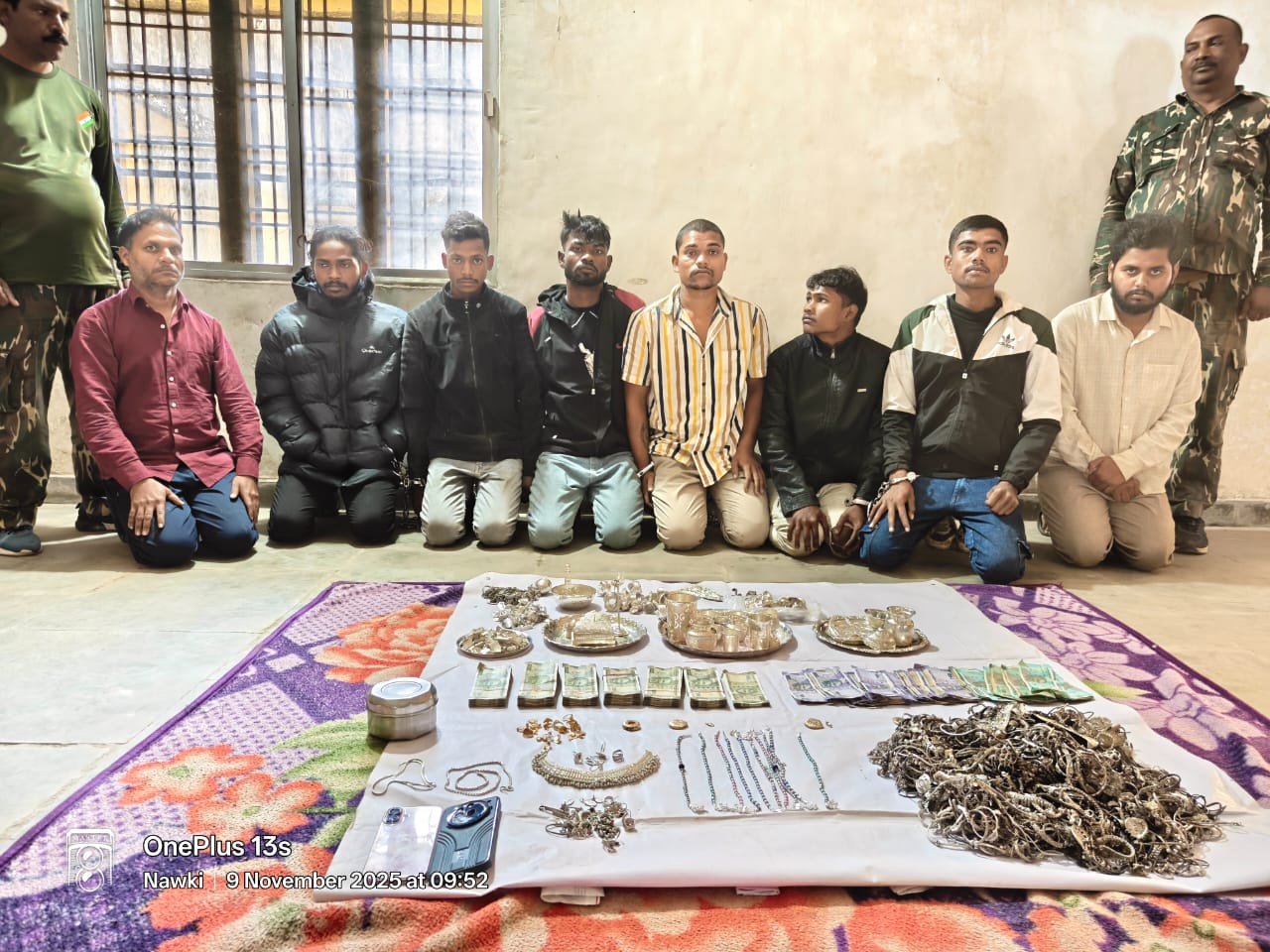बलरामपुर, विष्णु पांडेय। छत्तीसगढ़ के बलरामपुर जिले में हुई ज्वैलरी चोरी की बड़ी वारदात का पुलिस ने सात दिनों के भीतर खुलासा कर दिया है। दहेजवार चौक स्थित धनंजय ज्वेलर्स में 30 और 31 अक्टूबर की दरमियानी रात को हुई चोरी में शामिल शातिर आरोपितों को विशेष अनुसंधान टीम ने तकनीकी जांच, सीसीटीवी फुटेज और स्थानीय सूचना तंत्र के सहयोग से पकड़ लिया। पुलिस ने चोरी में शामिल आठ आरोपितों को गिरफ्तार कर उनके कब्जे से लगभग पचास लाख रुपये मूल्य की चोरी की संपत्ति बरामद की है, जिसमें सोना, चांदी, नगद रकम, मोबाइल फोन और वाहन शामिल हैं।