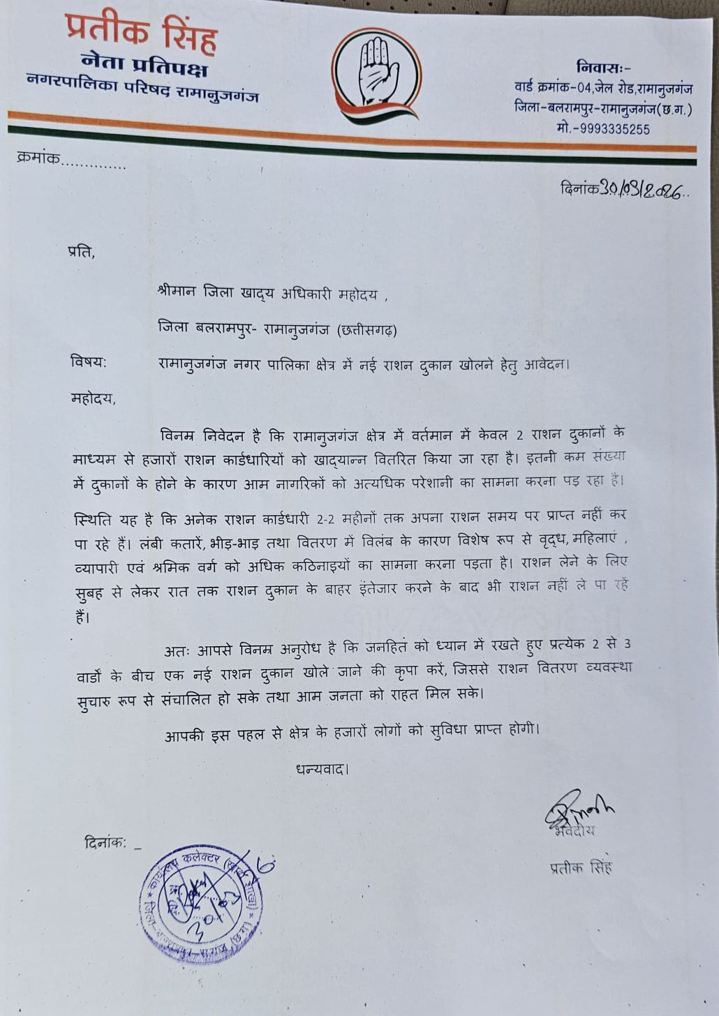 बलरामपुर। जिले के रामानुजगंज नगर पालिका क्षेत्र में बिगड़ती राशन वितरण व्यवस्था को लेकर अब आवाज तेज हो गई है। नगर पालिका परिषद के नेता प्रतिपक्ष प्रतीक सिंह ने जिला खाद्य अधिकारी को आवेदन सौंपते हुए नई राशन दुकानों के संचालन की मांग उठाई है। उन्होंने कहा कि मौजूदा व्यवस्था आम नागरिकों की बुनियादी जरूरतों को पूरा करने में पूरी तरह विफल साबित हो रही है।