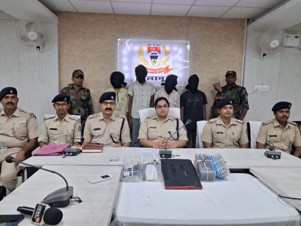 पलामू। पलामू की छतरपुर पुलिस ने सीएसपी बैंक लूटने की योजना बनाते चार लुटेरों को गिरफ्तार किया है। इनके पकड़े जाने से दो ग्राहक सेवा केंद्र (सीएसपी) बैंक लूटकांड का खुलासा हुआ है। उनके पास से देशी कट्टा, रिवालवर, दो गोली, लूटा हुआ लैपटॉप, मोबाइल, एक स्कूटी और चार वॉकी-टॉकी बरामद किया गया है। चार लुटेरों में से एक के खिलाफ शहर थाना मेदिनीनगर, छतरपुर और रांची के खलारी थाना में आपराधिक मामला दर्ज है।