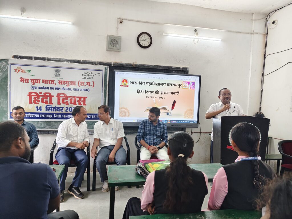 बलरामपुर। शासकीय महाविद्यालय बलरामपुर में राष्ट्रीय हिन्दी दिवस पर आज सोमवार को भव्य आयोजन हिन्दी विभाग एवं आंतरिक गुणवत्ता आश्वासन प्रकोष्ठ (आईक्यूएसी) के संयुक्त तत्वावधान में सम्पन्न हुआ। कार्यक्रम की अध्यक्षता प्राचार्य प्रो. नंद कुमार देवांगन ने की और वे मुख्य अतिथि भी रहे।