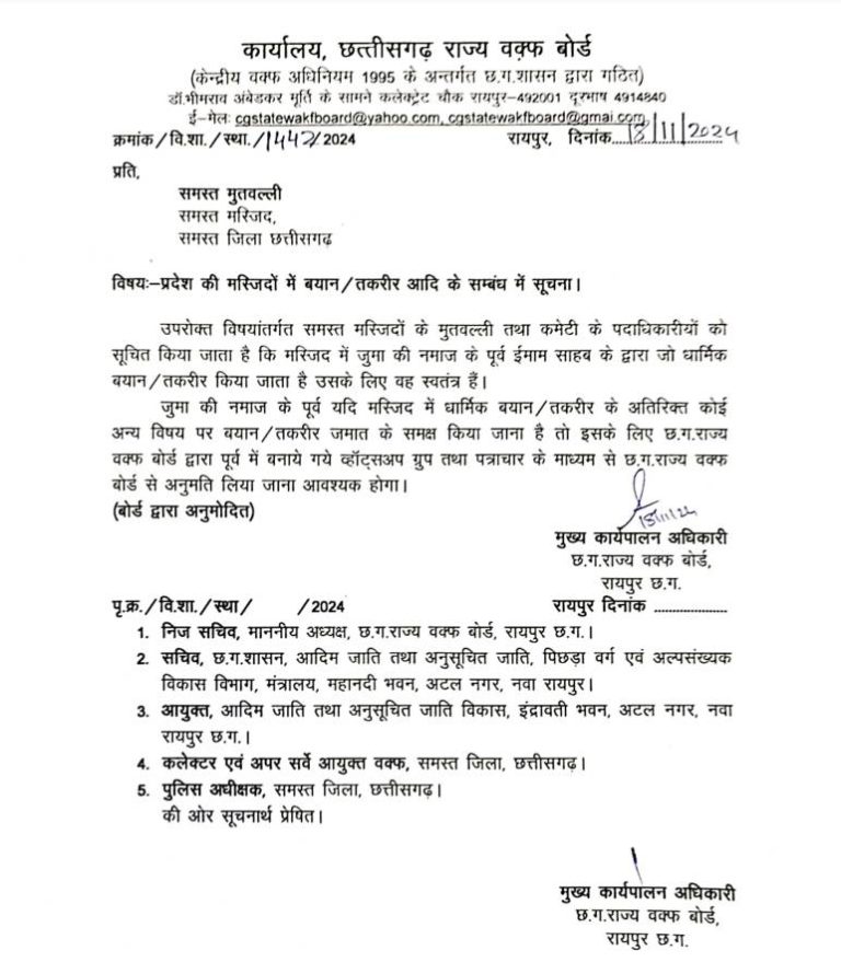 छत्तीसगढ़ राज्य वक्फ बोर्ड के अध्यक्ष डॉ सलीम राज ने कहा कि 3,842 मुतवल्लियों का एक ग्रुप बनाया गया है। मकसद है किसी भी बेतुके बयान के लिए कार्रवाई की जा सके। मस्जिदों के इमामों से कुरान के अनुसार भाषण देने और राजनीति को राजनेताओं पर छोड़ देने का आग्रह किया गया है। हम मस्जिदों को राजनीति का अड्डा नहीं बनने देंगे। बोर्ड ने इस संबंध में सोमवार को छत्तीसगढ़ के सभी जिलों की मस्जिदों के मुतवल्लियों (सदर) के नाम एक पत्र जारी किया, जिसमें कहा गया है कि मस्जिदों के मुतवल्ली और कमेटी के पदाधिकारियों को सूचित किया जाता है कि मस्जिद में जुमा की नमाज के पूर्व ईमाम साहब के द्वारा जो धार्मिक बयान/तकरीर किया जाता है, उसके लिए वह स्वतंत्र है।