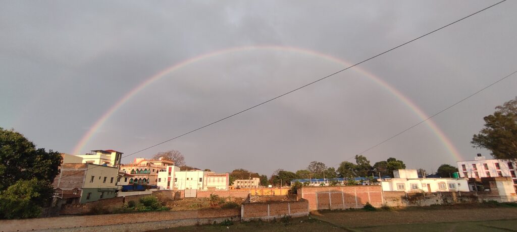 रांची, विष्णु पांडेय। शनिवार को दोपहर के बाद से रांची के मौसम में बदलाव देखने को मिला। कभी तेज बारिश तो कभी खिला धूप। दोपहर लगभग दो बजे आसमान में काले बादल छाए और जमकर बारिश हुई। इस बीच तेज हवा भी चल रही थी। लगभग आधे घंटे की तेज बारिश के बाद आसमान साफ हो गया। फिर साढ़े चार बजे के करीब बारिश हुई। तेज हवा के साथ बारिश हुई। बारिश के बाद आसमान खुला। आसमान साफ होते ही सतरंगी छटा से आसमान भर गया। रांची के आसमान में इंद्रधनुष देखने को मिला। आसमान में इंद्रधनुष का दो सर्कल दिखाई दिया।