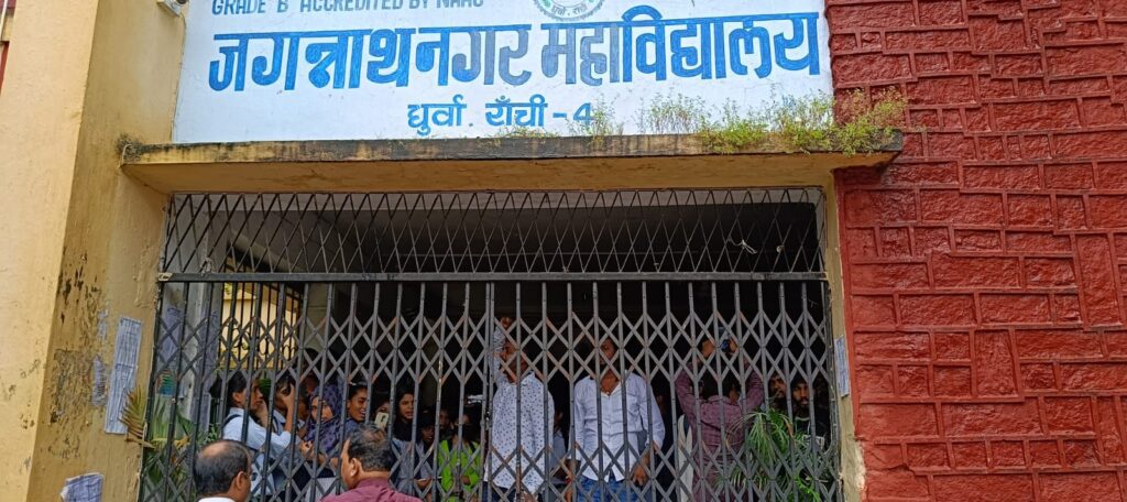 रांची, (हि. स.)। धुर्वा थाना क्षेत्र स्थित जगन्नाथपुर महाविद्यालय (जेएन कॉलेज) के मुख्य गेट में मंगलवार को छात्रों ने तालाबंदी की। आक्रोशित छात्र कॉलेज के एंथ्रोपॉलजी के एचओडी प्रोफेसर रवि भूषण साहू पर कार्रवाई की मांग को लेकर तालाबंदी की है।