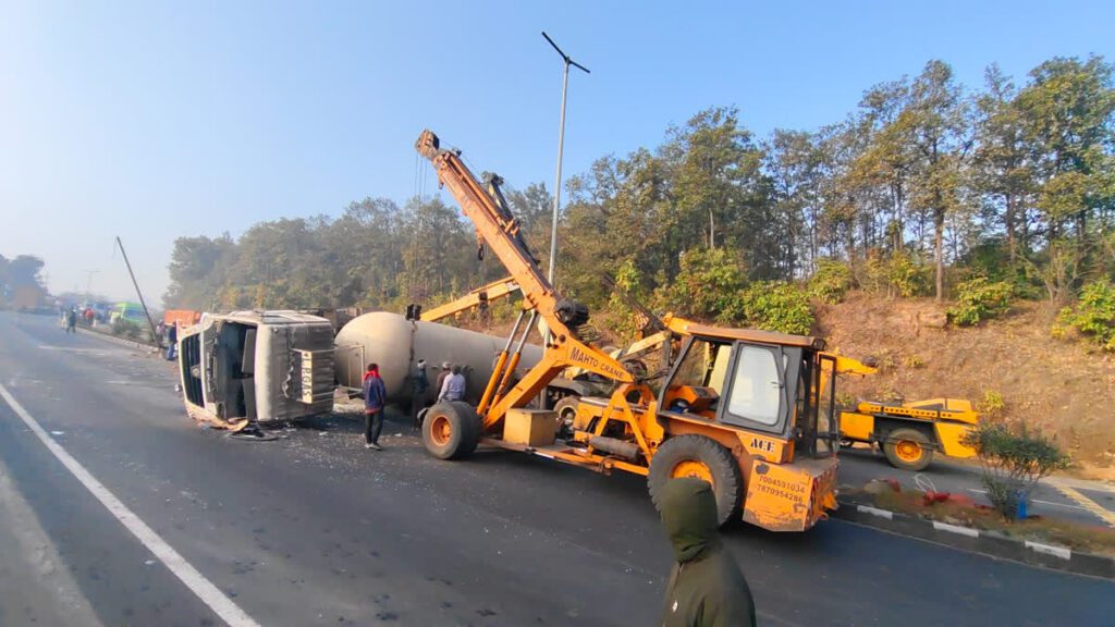 रामगढ़। रामगढ़ जिले के चुट्टूपालू घाटी में शुक्रवार को एलपीजी गैस का टैंकर पलट गया। इस हादसे के बाद राष्ट्रीय राजमार्ग 33 पूरी तरीके से जाम हो गया है। गड़के मोड़ के पास एलपीजी गैस से लदा एक टैंकर अनियंत्रित होकर बीच सड़क पर पलट गया, जिससे रांची-पटना मुख्य मार्ग एनएच 33 का घाटी इलाका पूरी तरह जाम हो गया। एलपीजी गैस टैंकर पारादीप से काठमांडू जा रहा था।घटना की सूचना पाकर मौके पर पहुंची रामगढ़ पुलिस ने हाइड्रा और क्रेन के साथ-साथ फायर ब्रिगेड की गाड़ियों को बुलाकर एलपीजी गैस से भरे टैंकर को उठाने का प्रयास कर रही है।