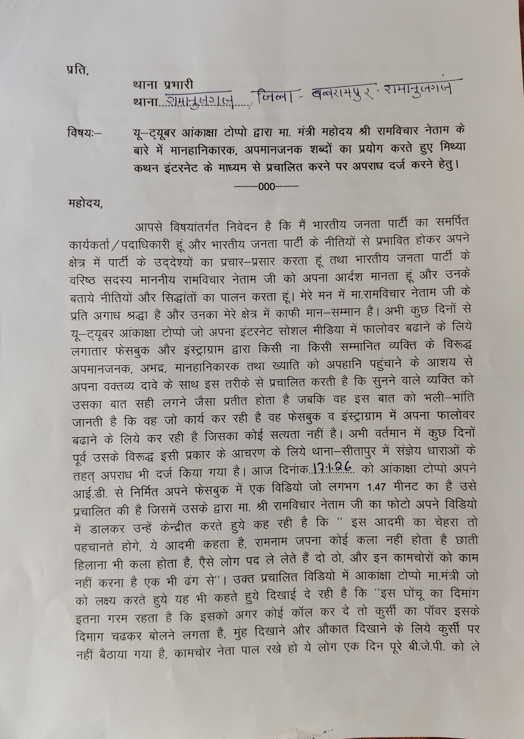 जानकारी अनुसार, थाना रामानुजगंज, जिला बलरामपुर-रामानुजगंज में भाजपा कार्यकर्ताओं द्वारा यू-ट्यूबर आकांक्षा टोप्पो के खिलाफ गंभीर आरोपों के साथ आवेदन दिया गया है। शिकायत में कहा गया है कि, आकांक्षा टोप्पो ने अपने फेसबुक अकाउंट से लगभग 1 मिनट 47 सेकंड का एक वीडियो प्रसारित किया, जिसमें छत्तीसगढ़ शासन के मंत्री एवं भाजपा के वरिष्ठ नेता रामविचार नेताम को केंद्र में रखते हुए अभद्र, अपमानजनक और मानहानिकारक शब्दों का प्रयोग किया गया।