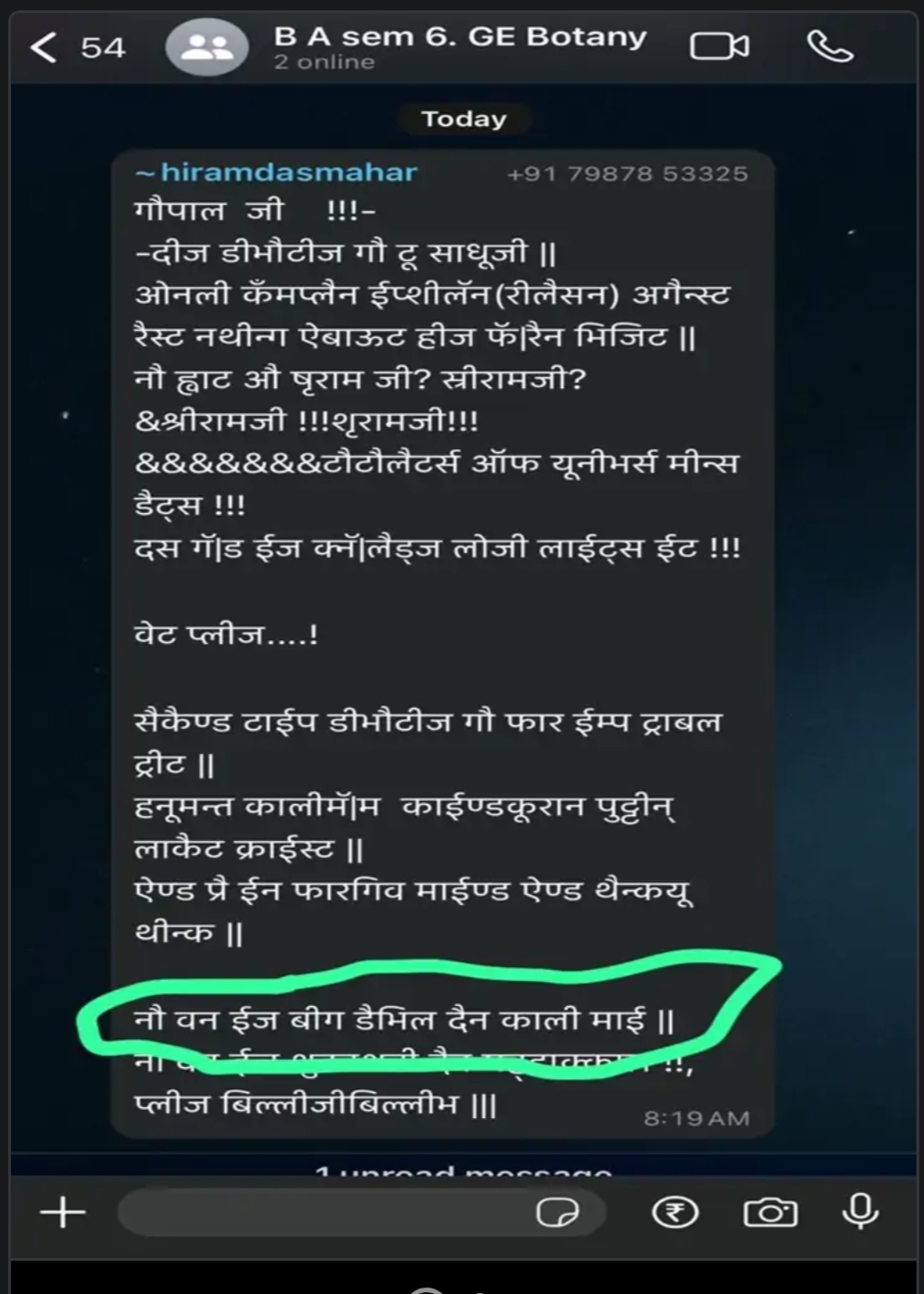 प्राप्त जानकारी के अनुसार, सरगुजा पीजी कॉलेज के एक सीनियर प्रोफेसर ने आज शुक्रवार की सुबह एक व्हाट्सएप ग्रुप में काली का पोस्ट डाला जिसमें लिखा गया है कि, मां काली से बड़ा कोई शैतान नहीं है। पोस्ट का स्क्रीनशॉट लेकर छात्रों ने हिंदू संगठनों को भेज दिया। मामला तूल पकड़ने लगा भाजपा के जिला मंत्री इंद्र भगत के साथ बड़ी संख्या में कार्यकर्ता गांधीनगर थाने पहुंचे और थाना प्रभारी को ज्ञापन सौंप कार्रवाई की मांग की है।