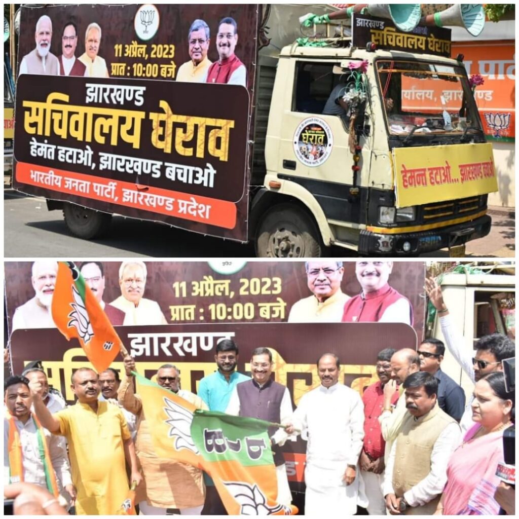 रांची: झारखंड सरकार पर भ्रष्टाचार का आरोप लगाते हुए बीजेपी ने कल 11 अप्रैल यानी मंगलवार को सचिवालय घेराव का निर्णय लिया है। इस सिलसिले में पार्टी की ओर से प्रदेश व्यापी तैयारियां की जा रही हैं। पार्टी की माने तो राज्य भर से आए 3 लाख कार्यकर्ता सचिवालय घेराव कार्यक्रम में हिस्सा लेंगे। पार्टी की ओर से एक नारा लगाया गया है जिसके तहत कहा गया है-‘हेमंत हटाओ झारखंड बचाओ’। सचिवालय घेराव कार्यक्रम में आम जन भागीदारी सुनिश्चित करने के उद्देश्य से सोमवार को पार्टी के रांची स्थित प्रदेश कार्यालय से प्रचार वाहन रवाना किया गया।