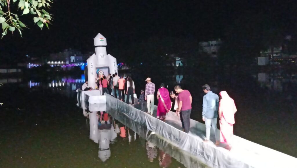 आमापारा के बनिया तालाब में स्थित गणेशजी और चन्द्रयान की झांकी को देखने के लिए दूर-दूर से लोग पहुंच रहे है। शाम ढलते ही यहां श्रद्धालुओं की भीड़ उमड़ रही है। 11 दिवसीय गणेशोत्सव को लेकर धमतरी में धर्ममय वातावरण निर्मित हो गया है। आमापारा में सत्यम गणेश उत्सव समिति द्वारा तालाब में मूर्ति स्थापित कर झांकी बनाई जाती है। तालाब के किनारे से करीब 65 फीट दूर पानी में स्टेज सजाकर चन्द्रयान की झांकी सजाई है। करीब 15 फीट ऊंचे तथा सात फीट चौड़ाई वाले यह चन्द्रयान की झांकी देखते ही बन रही है। इसे देखने के लिए शहर समेत दूर-दराज गांवों से श्रद्धालु पहुंच रहे हैं। समिति की ओर से पिछले 16 सालों से बनिया तालाब के 12 फीट गहरे पानी में गणेशजी स्थापित करते आ रहे हैं। समिति के अध्यक्ष शैलेन्द्र नाग, उमेश नाग, दिनेश पटेल, पप्पू पटेल, विकास साहू, जीवेश साहू ने बताया कि इसके पहले शहर की ज्वलंत समस्या को देखते हुए बाइपास सड़क की झांकी बनाई थी। इसके अलावा स्वच्छता को लेकर जागरूक करने एक कदम स्वच्छता की ओर झांकी सजाया था। पीएम आवास, समुद्र मंथन, रामसेतु की झांकी सजा चुके है।