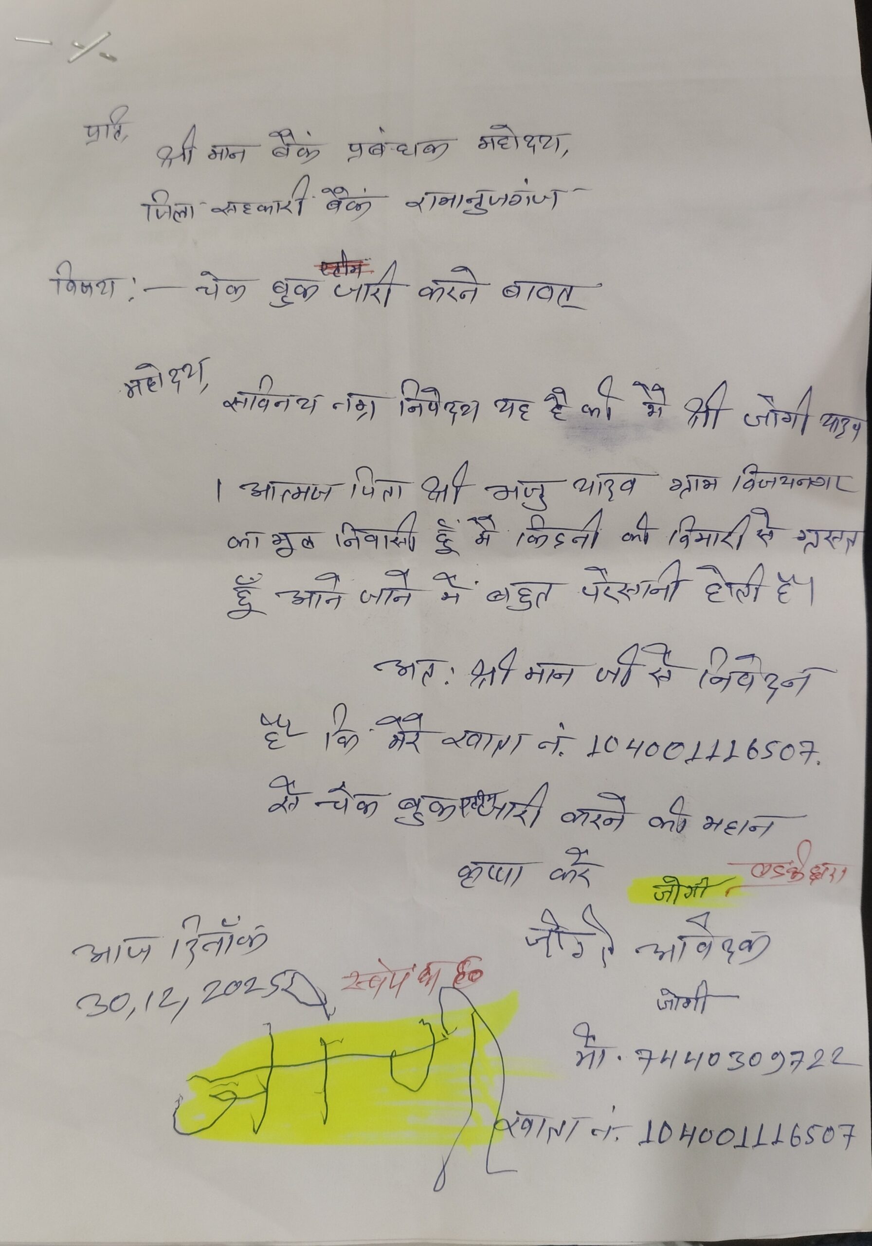 उमेश यादव का आरोप है कि उन्होंने अपने पिता जोगी यादव के नाम से चेकबुक के लिए आवेदन किया था, लेकिन बैंक द्वारा कई बार उनका आवेदन निरस्त कर दिया गया। इस कारण समय पर इलाज के लिए धनराशि नहीं मिल पाई, जिससे उनके पिता की तबीयत और स्थिति पर असर पड़ा।