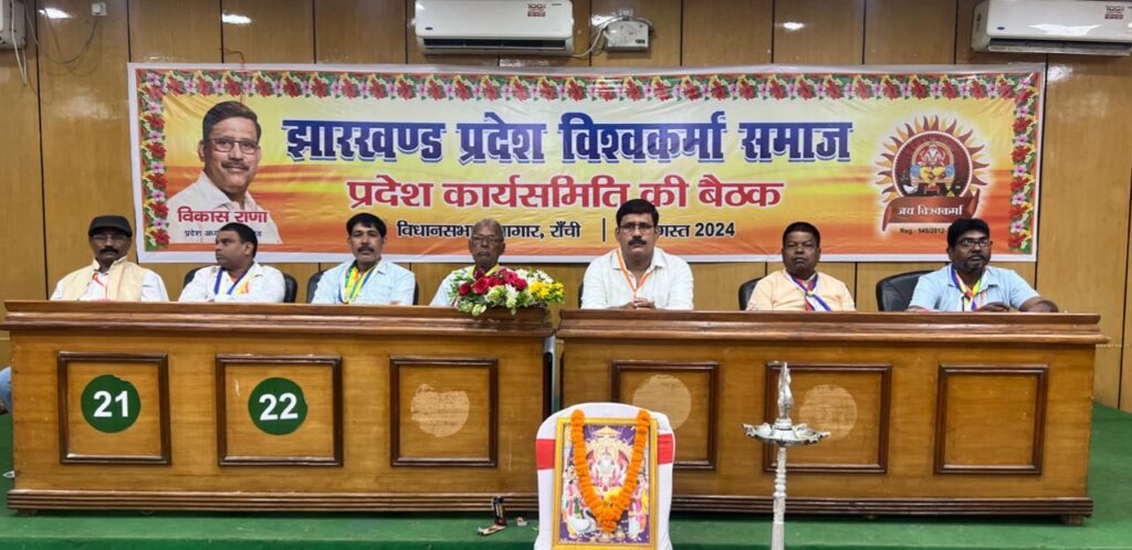 रांची। झारखण्ड प्रदेश विश्वकर्मा समाज की प्रदेश कार्यसमिति की बैठक स्थानीय विधानसभा सभागार राँची में आयोजित की गई ! प्रदेश कार्यसमिति की बैठक की अध्यक्षता विश्वकर्मा समाज के प्रदेश अध्यक्ष विकास राणा और मंच संचालन प्रदेश प्रधान महासचिव संतन शर्मा ने किया । प्रदेश कार्यसमिति की बैठक में मुख्य रूप से प्रदेश कमेटी के सभी पदाधिकारी एवं प्रदेश कार्यकारिणी के सदस्य, सभी जिला के जिला अध्यक्ष, जिला महासचिव, जिला कोषाध्यक्ष सहित विश्वकर्मा समाज के गणमान्य शामिल हुए। बैठक में कई बिंदुओं पर महत्वपूर्ण निर्णय लिए गए।