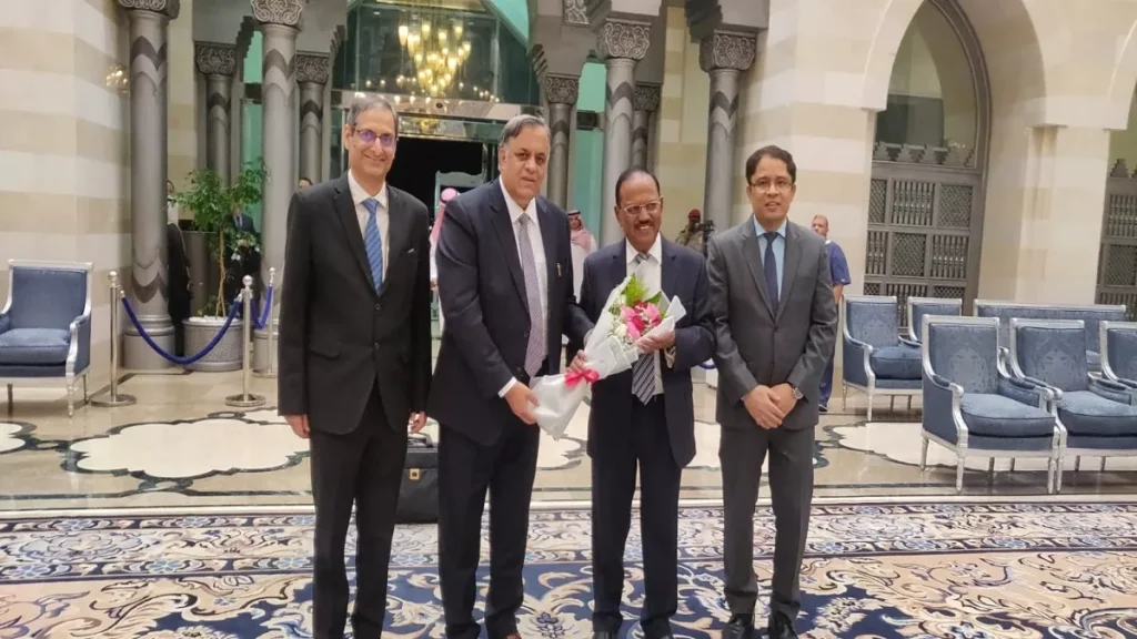 सऊदी अरब। सऊदी अरब की मेजबानी में चल रहे राष्ट्रीय सुरक्षा सलाहकारों और अन्य अधिकारियों के एक शिखर सम्मेलन में भाग लेने के लिए NSA अजीत डोभाल जेद्दा पहुंचे। इस दौरान भारतीय राजदूत सुहेल खान और महावाणिज्यदूत मोहम्मद शाहिद आलम ने जेद्दा हवाई अड्डे पर डोभाल का स्वागत किया।