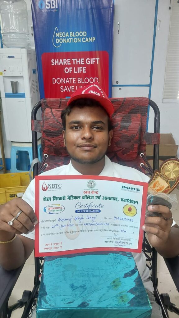 भारतीय स्टेट बैंक और वर्ल्ड केयर फाउंडेशन ऑफ इंडिया के संयुक्त तत्वावधान में सदर ब्लड बैंक हजारीबाग के सहयोग से ग्राउंड फ्लोज में सुबह 11 बजे से शाम 4 बजे तक रक्तदान महादान का कार्यक्रम चला। इस मौके पर जयप्रभा नगर निवासी अखौरी आदित्य सहाय ने पहली बार रक्तदान किया।